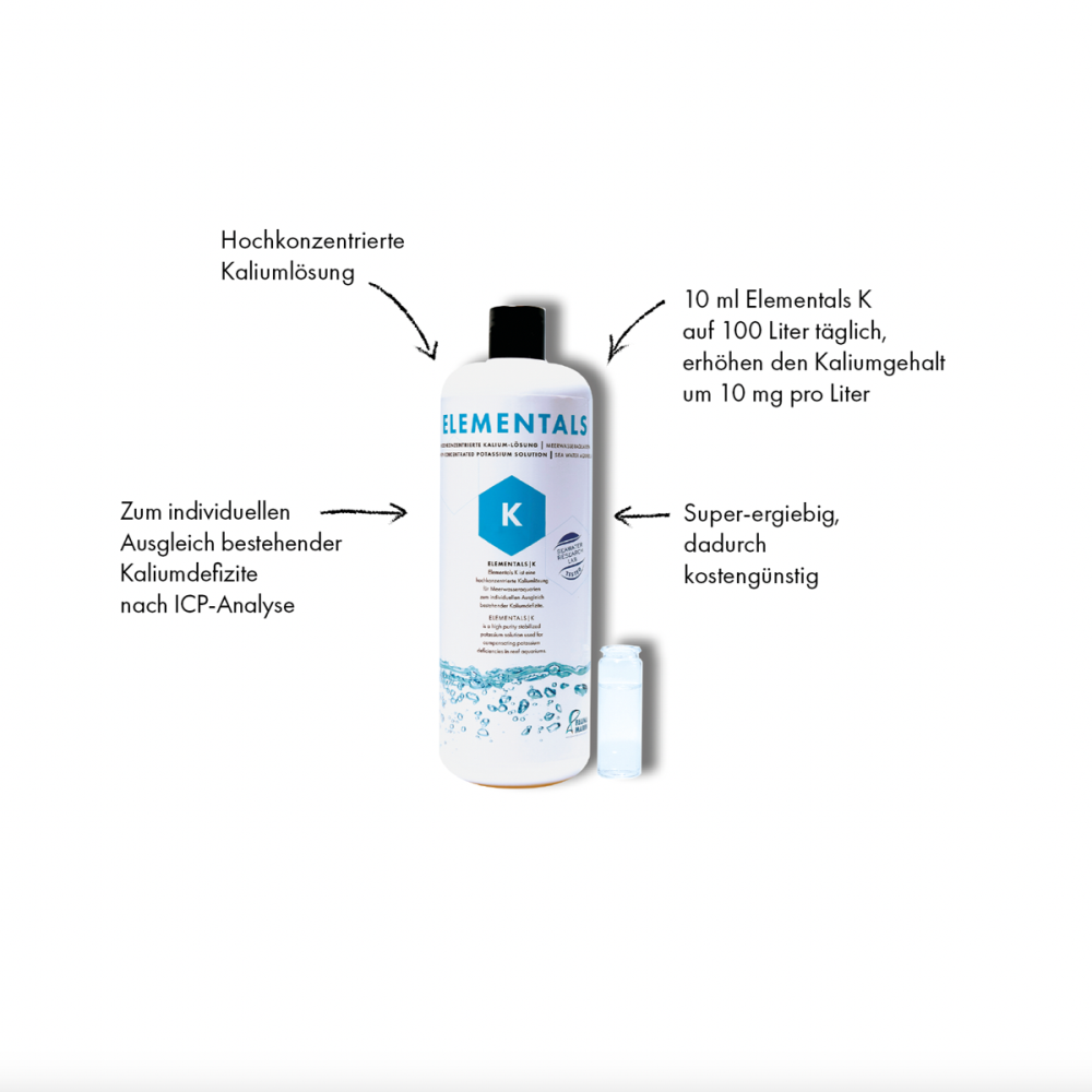 Elementals K ist eine hochkonzentrierte Kaliumlösung für Meerwasseraquarien zum individuellen Ausgleich bestehender Kaliumdefizite.