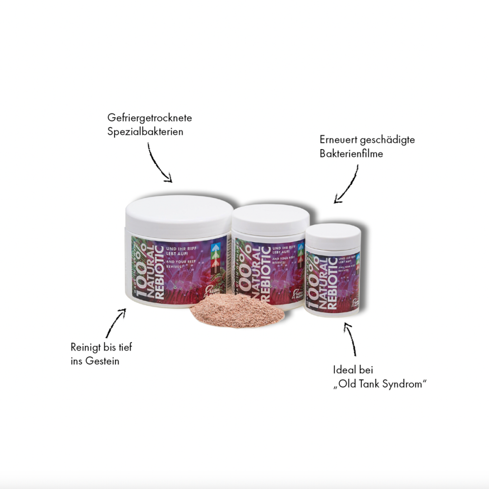 Gefriergetrocknete Spezialbakterien-Mischung zur Wiederherstellung eines stabilen Bakterienmilieus im Meerwasser. REBIOTIC Spezialbakterien erneuern die Bakterienfilme in Riffaquarien, die durch Systemwechsel oder dem “Old Tank Syndrom” beschädigt wurden oder nicht mehr voll funktionsfähig sind.