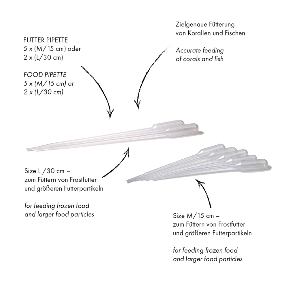 - 2 x large pipettes (30cm) for feeding frozen food and larger food particles.