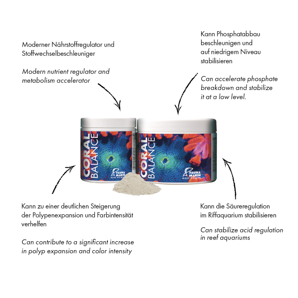 Coral Balance ist ein moderner Nährstoffregulator und Stoffwechselbeschleuniger, speziell entwickelt um in Riffaquarien den natürlichen Nährstoffkreislauf und Säureregulation zu reaktivieren und zu stabilisieren. Hierbei wird im besonderen der sonst nur schwer zu kontrollierende Phosphatabbau beschleunigt und auf niedrigem Niveau stabilisiert.