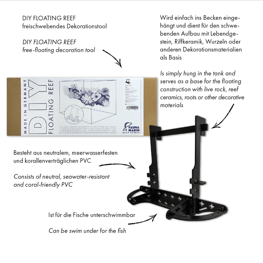 Das neue Fauna Marin DIY FLOATING REEF ist ein Dekorationstool, mit dem außergewöhnliche, schwebend erscheinende Riffdekorationen möglich sind. Dabei bleibt der Bodengrund frei und die gesamte Dekoration ist für die Fische unterschwimmbar. Unser DIY FLOATING REEF wird einfach ins Becken eingehängt und dient für den schwebenden Aufbau mit Lebendgestein, Riffkeramik, Wurzeln oder anderen Dekorationsmaterialien als Basis. Es besteht aus neutralem, meerwasserfesten und korallenverträglichen PVC. Durch das innovative Stecksystem kann es leicht selbst montiert werden und ist zudem individuell ausbaubar.