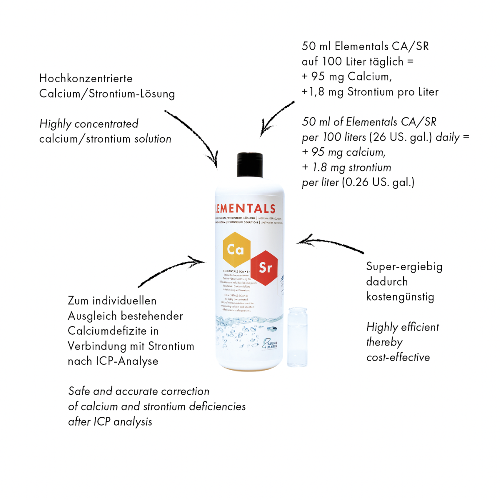 ELEMENTALS Ca + Sr ist eine hochkonzentrierte Calcium-/Strontiumlösung für Riffaquarien zum individuellen Ausgleich bestehender Calciumdefizite in Verbindung mit Strontium.