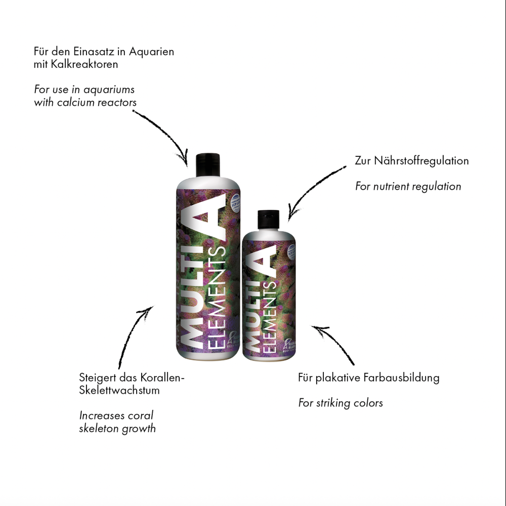 - In Multi Elements A befinden sich Elemente, die für das Korallen-Skelettwachstum, die Nährstoffregulation und eine plakative Farbausbildung verantwortlich sind.