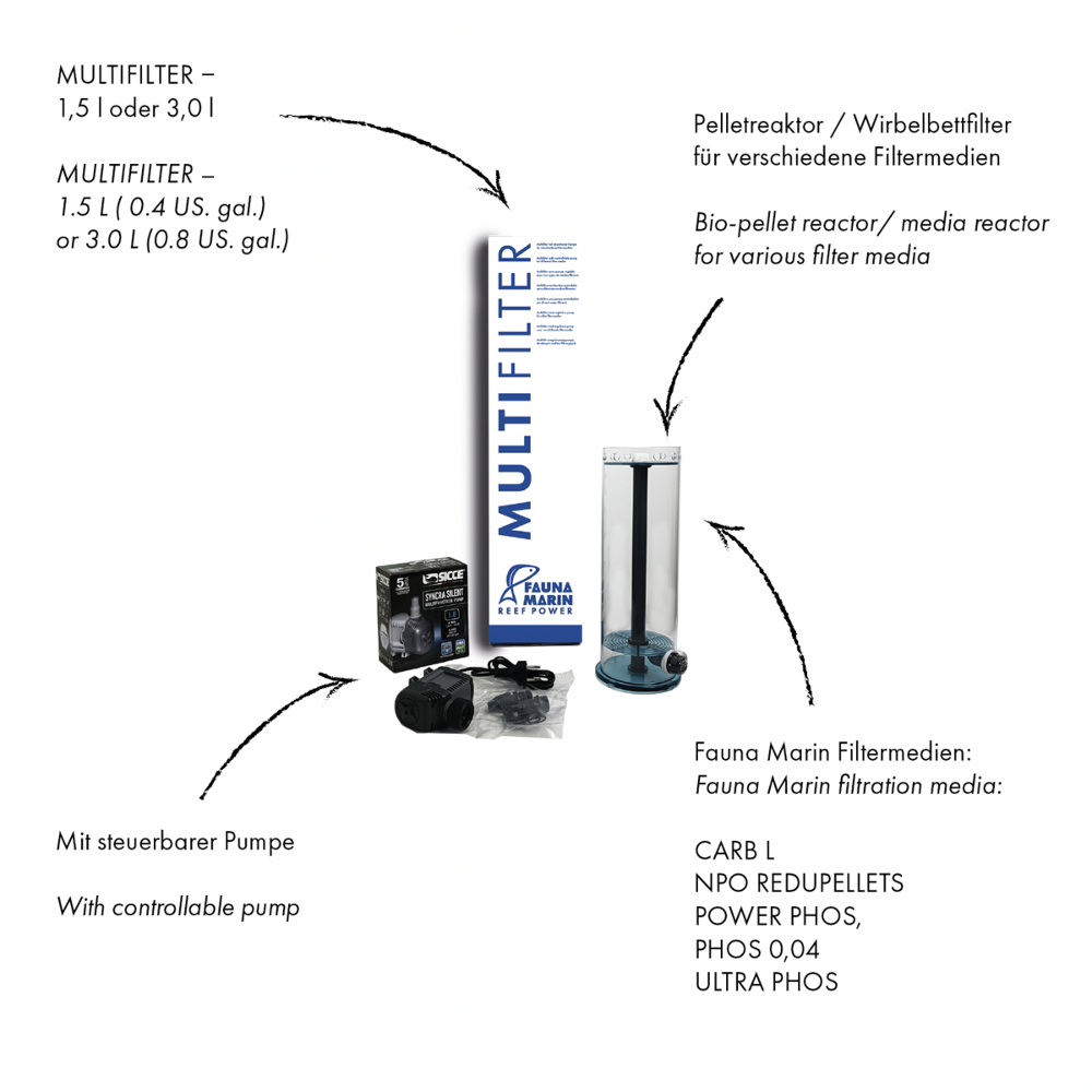 Der Fauna Marin Multifilter ist vielseitig und auf kleinstem Raum mit den folgenden Filtermedien einsetzbar: