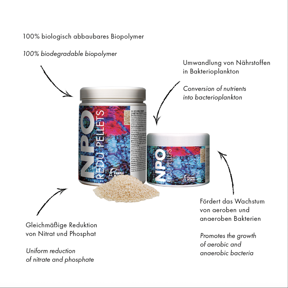 - Aufgrund ihrer hohen Dichte werden NPO Redupellets, aber nur sehr langsam abgebaut und Sie benötigen wesentlich weniger Pellets als bei den meisten angebotenen Produkten