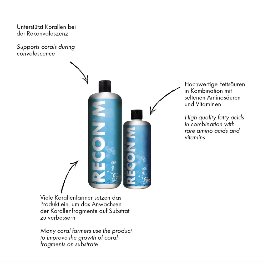 RECON M fördert gezielt den Aufbau des Gewebes, versorgt die Koralle mit hochwertigen Proteinen für den Aufbau der Widerstandskräfte und die Regeneration. Zudem wird die Ausbildung der Basalscheiben verstärkt. Viele Korallenfarmer setzen das Produkt ein, um das Anwachsen der Korallenfragmente auf Substrat zu verbessern.