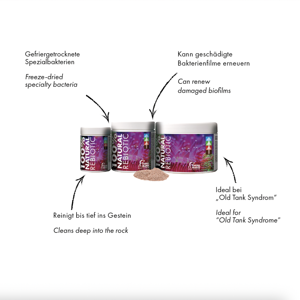 Gefriergetrocknete Spezialbakterien-Mischung zur Wiederherstellung eines stabilen Bakterienmilieus im Meerwasser. REBIOTIC Spezialbakterien erneuern die Bakterienfilme in Riffaquarien, die durch Systemwechsel oder dem “Old Tank Syndrom” beschädigt wurden oder nicht mehr voll funktionsfähig sind.
