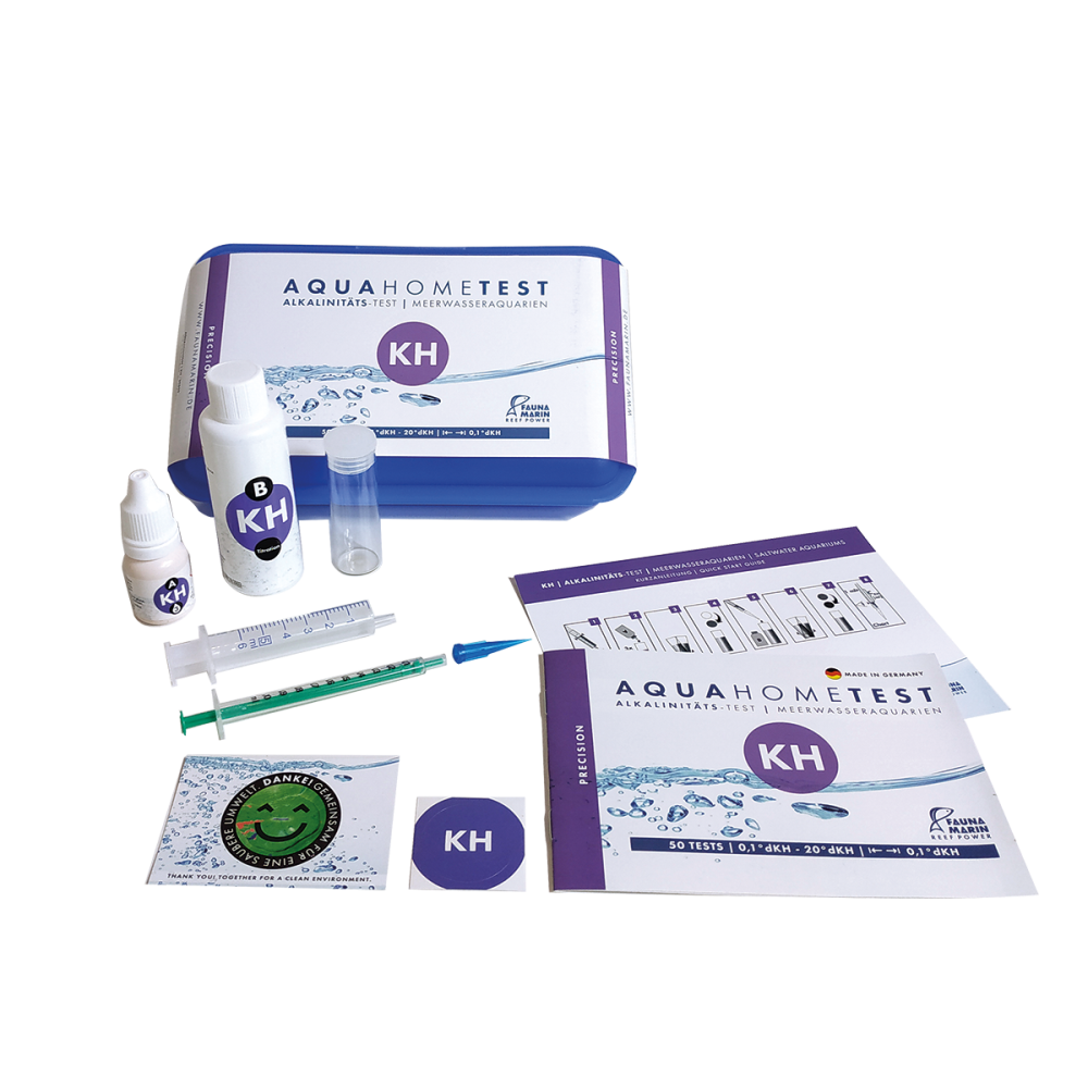 The carbonate hardness (KH) or alkalinity* of a water sample characterises the buffering capacity, i.e. the ability to maintain the pH value of the water. It is primarily defined by the proportion of hydrogen carbonate ions in the water. As the pH value increases, other basic ions such as the hydroxide ions also contribute to the alkalinity. The alkalinity should be tested in all aquariums regularly. If the alkalinity in the aquarium is too low, the pH value can sink (sudden drop in acidity) to a level which is life-threatening for many fish and invertebrates. In reef aquariums, an adequate alkalinity is essential for strong coral growth. On the other hand, an overly high alkalinity in saltwater tanks can lead to lime precipitates and also have a negative impact on coral growth.