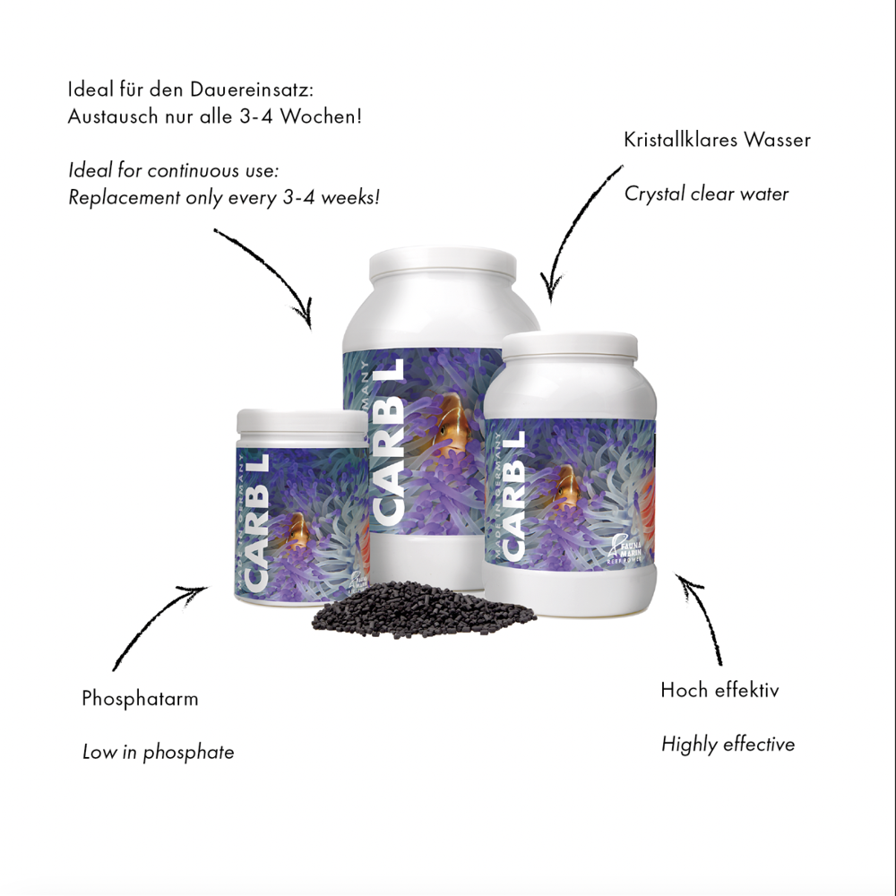 Extremely pure, vapour-activated and pre-washed carbon for efficient removal of yellowness, turbidity and harmful toxins, essential for maintaining good water quality in any aquarium. Carb L is almost entirely free of phosphate and has an extremely high capacity. Carb L is specifically made for permanent and long-term use but should be exchanged every 30 days. Suitable for freshwater and marine aquaria, cleans the water without any negative side effects.