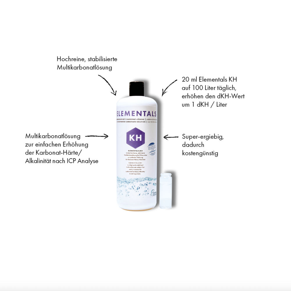 ELEMENTALS KH is a high purity stabilized multi-carbonate solution that easily increases the carbonate hardness/alkalinity in reef aquariums.