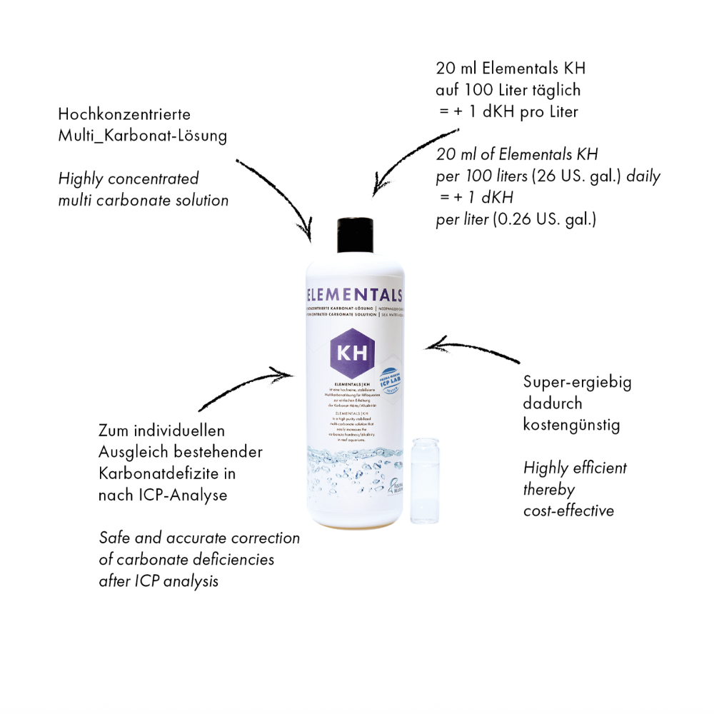 ELEMENTALS KH is a high purity stabilized multi-carbonate solution that easily increases the carbonate hardness/alkalinity in reef aquariums.