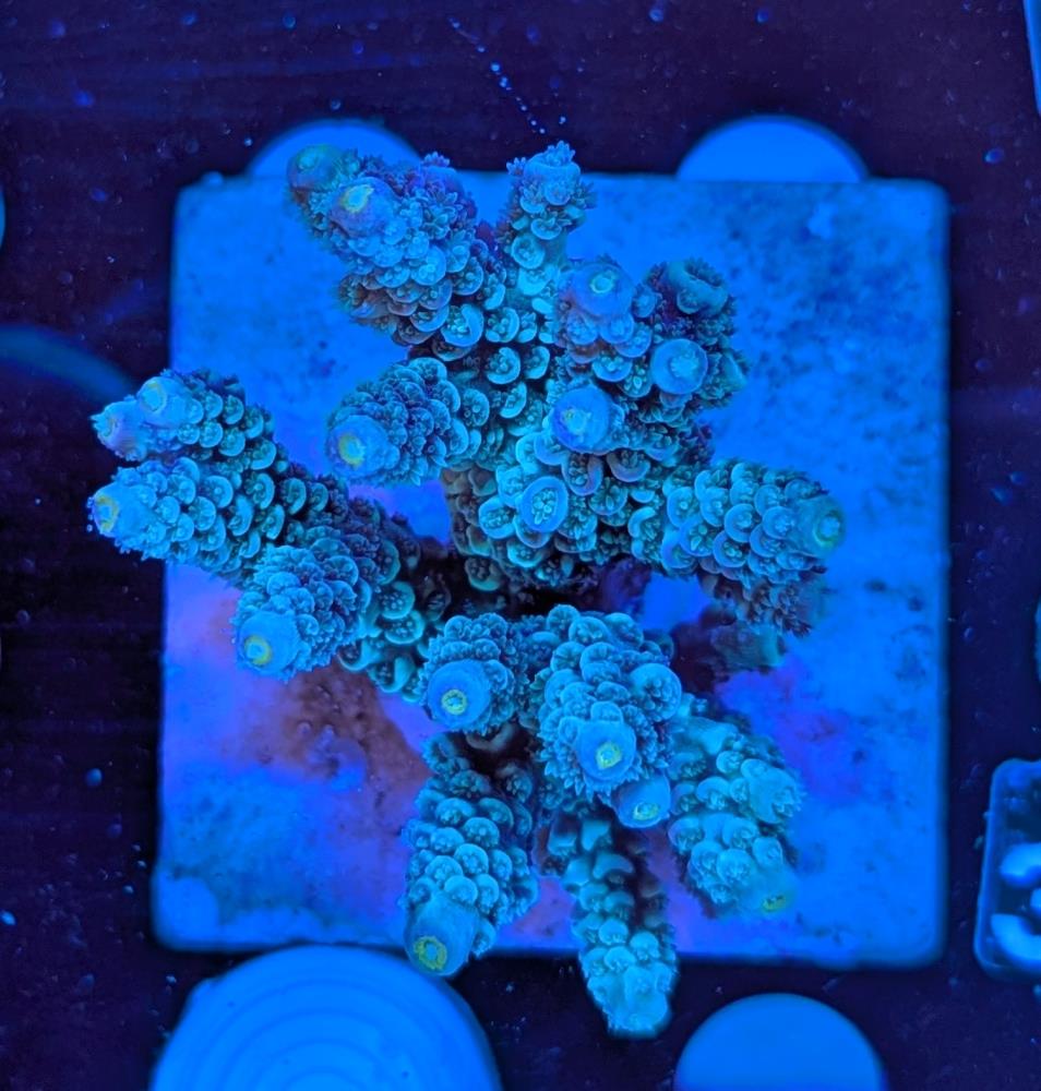 Please note that coral variations in form and color can occur in the original photo. Changes in color may also result from transport or due to the color representation on the computer screen . Our corals are lit with Radions G4 Pro and are photographed in these conditions. The colors of the animals may vary from our photos when placed in your aquarium, depending on the type of lighting used.