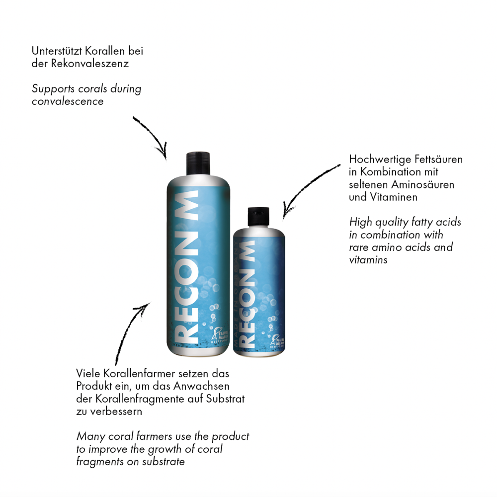 RECON M specifically promotes tissue regeneration, provides the coral with high-quality proteins to strengthen resistance and support recovery, and enhances the formation of basal discs. Many coral farmers use the product to improve the attachment of coral fragments to substrates.