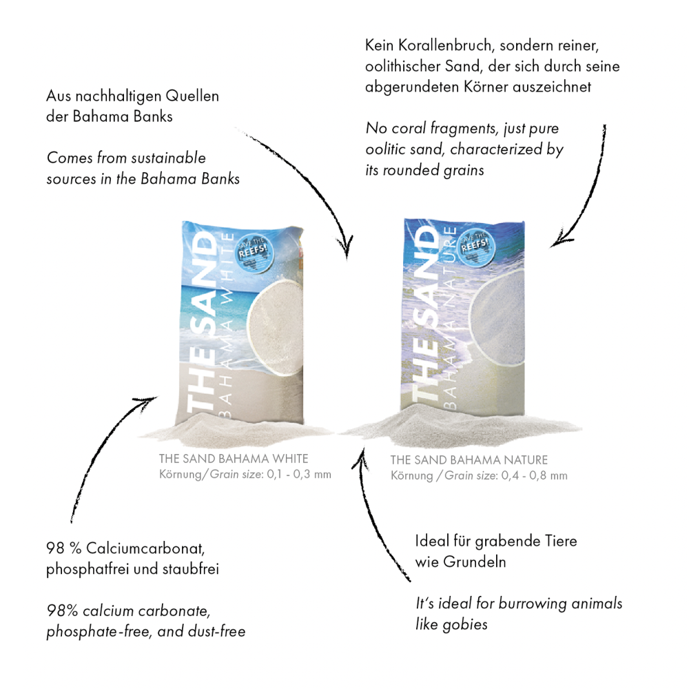 Whether Bahama White or Bahama Natural, THE SAND supports the natural behavior of your animals and provides an optimal environment. The oolitic grains promote substrate aeration, contributing to a stable and healthy aquarium.